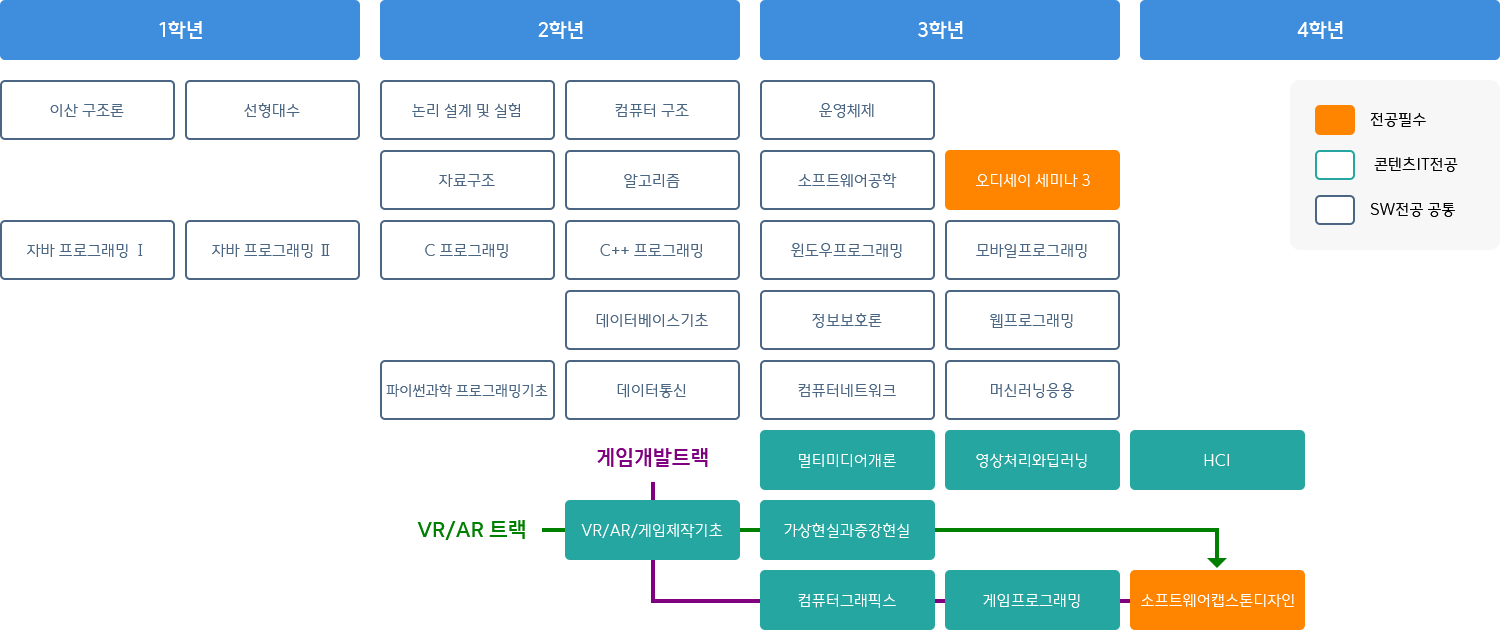 첨단 IT분야 중 하나인 콘텐츠IT 분야에 특화된 전문 인력 양성을 목표로, 실무 중심의 교육을 통하여 콘텐츠 관련 산업계에서 요구하는 전문적인 소프트웨어 개발 능력을 배양합니다. 최근 콘텐츠IT 분야의 전문 인력 수요를 고려하여, 저희 전공에서는 가상현실/증강현실(VR/AR) 트랙과 게임 개발자 트랙으로 구분하여 진로를 계획적으로 설정하고 학업을 체계적으로 이수할 수 있도록 도움을 주고 있습니다.전공위원회 교수 : 박찬영, 김선정, 김유섭, 김은주, 김의직, 허종욱, 방기석, 신범주